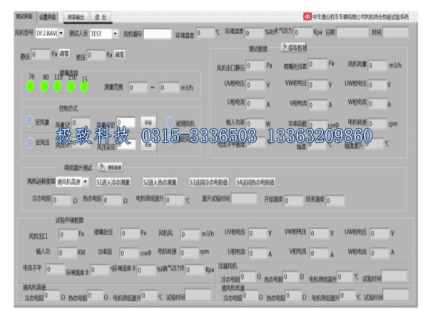 风机试验台是一针对轨道列车通风机和冷凝风机开发的试验检验测试装置,可运动风机的例行试验。 风机试验台由风洞、电源柜、控制柜、工控机等构成,操作均在工控机上位画面上完成,电源柜为风机阳台提供三相交流电源;控制柜由仪表、指示灯、PLC、变频器、电机绕组测试仪、功率计等组成,完成各个试验动作所需逻辑;上位软件上 LabView开发,可检测风机起停、风量、风压、电流、电压、绕组温升等所需参数;软件自动生成报表,报表数据实现长期保存,能简单快捷的查看所作实验数据,数据可导出EXCEL表格,实现其他计算机上存储和查看。